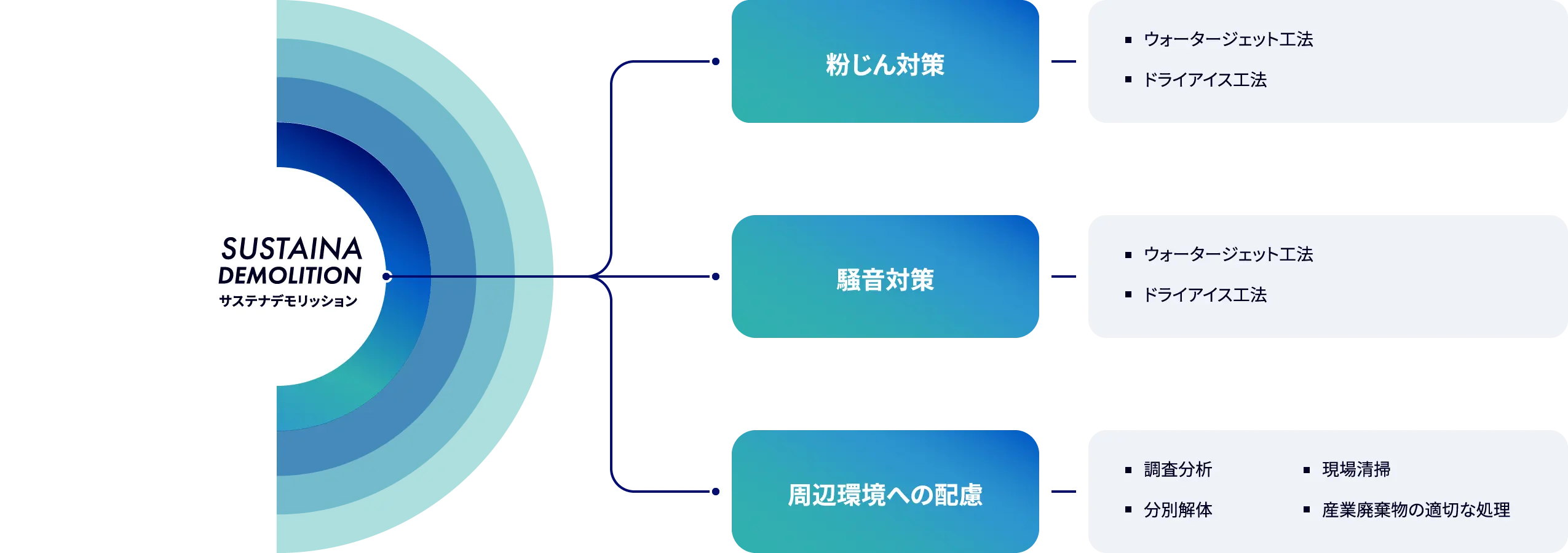 ウォータージェットは、非接触のため低振動・低騒音。従来の工法に比べ、騒音を大幅に低減することが可能なため、周辺環境にも、作業員の健康にもやさしい工法です。